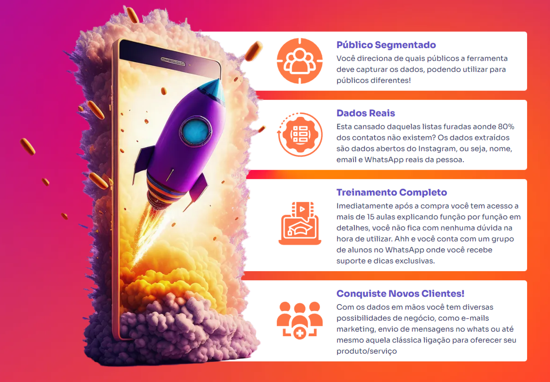 Imagine ter o WhatsApp, Nome, Telefone e E-mail do cliente com do seu concorrente ou daquele perfil semelhante ao seu? O InstaLead extrai milhares de usuários segmentados, te entregando listas de contatos infinitas para divulgar seu negócio ou serviço.